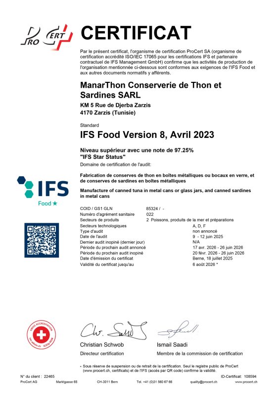 ManarThon impose à son usine les règles internationales d’hygiènes strictes de production alimentaire. Toutes les étapes de production sont sous contrôle et les productions répondent à un cahier des charges strict définis par des bureaux internationaux de certification.